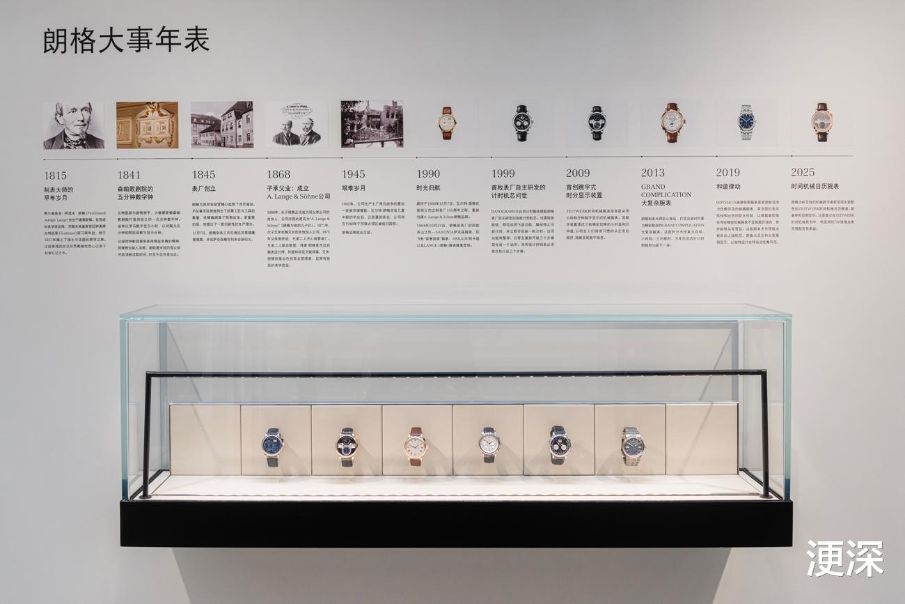 朗格限时精品店内还设有一面历史墙,回溯了萨克森精密制表发展历程的重要节点:1815年,一位即将改变萨克森州当地经济发展的费尔迪南多·阿道夫·朗格出生于德累斯顿,师从知名钟表大师约翰·克里斯迪昂·菲烈特里西·古特凯斯(Johann Christian Friedrich Gutkaes)学习制表知识与技能,随后历经瑞士与法国的游学之旅,1841年回到德累斯顿与其师傅兼岳父为森帕歌剧院打造传世之作——五分钟数字钟。1845年,费尔迪南多·阿道夫·朗格于格拉苏蒂镇建立属于自己的制表工坊,开启了萨克森精密制表业新纪元。20多年后,其两个儿子理查·朗格和艾米·朗格陆续加入公司,并将品牌更名为“A. Lange & Söhne”(朗格与他的儿子们),以各自擅长的领域开拓公司发展。理查·朗格作为一名制表师和发明家,热衷于研究机械制表的技术解决方案,他为制表发明了诸多专利技术,不断提升其精准性能,推动了精密制表技术的发展;而艾米·朗格则擅长商业管理,带领朗格赢得世界性的认同,亦获得萨克森王室的喜爱。1945年,表厂随着战火的席卷,连同名字一起消失在了制表行业。直至1990年,随着双德统一,家族第四代瓦尔特·朗格在曾祖父创立表厂的145周年之际,重新注册朗格钟表有限公司(Lange Uhren GmbH),将这一极具创造力的德国精密制表品牌带回大众视野。1994年10月24日,朗格的四款开山之作——LANGE 1朗格1腕表、SAXONIA萨克森腕表、陀飞轮“荣誉勋章”腕表,以及ARKADE阿卡德腕表隆重登场,并一举成名。1999年,朗格表厂自主研发的首枚计时机芯问世,该机芯搭载于朗格标志性的计时腕表DATOGRAPH大日历计时腕表和1815计时腕表中。2009年,首创采用跳字式数字显示时间的ZEITWERK时间机械腕表诞生。2013年,朗格最为精密复杂的GRAND COMPLICATION大复杂腕表问世,集结大、小自鸣、三问报时、万年历和双秒追针计时的功能于一身。2019年,彰显活力与优雅风范的腕表系列ODYSSEUS奥德修斯诞生,配备大日历和大型星期显示。