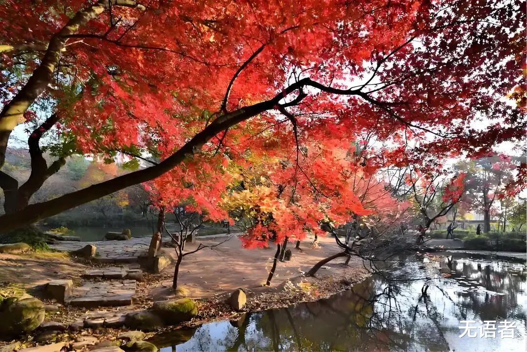 临水而立的枫影投入碧波,将赤焰延伸至倒影深处,形成虚实交错的燃烧感,仿佛整条水岸都被秋意点燃。