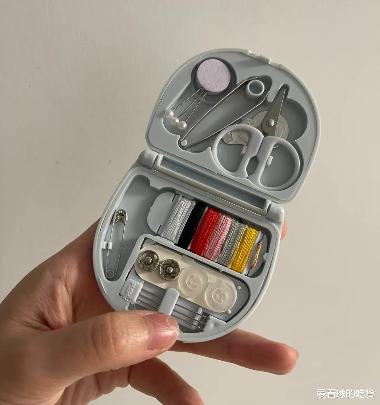 然后是针线盒,就五块多!别看它小,针、线、剪刀、纽扣……啥都有!我就是用它缝的窗帘花边,虽然线有点少,还得自己再买点,但整体还是很划算的!