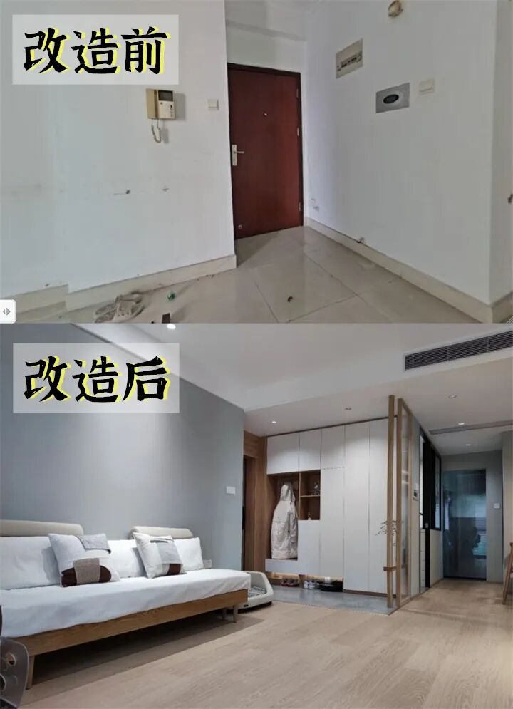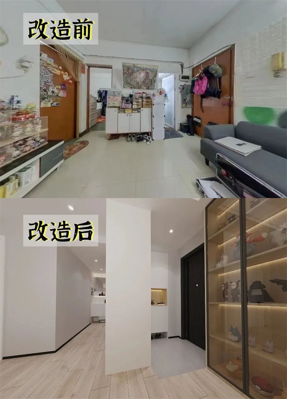 灵感参考:没有玄关、或玄关狭窄的户型,通过拆除入户旁的墙面,向相邻空间“借面积”,实现从“满地鞋子”到“开门整洁”的改造。