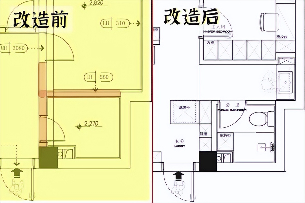 改造思路:将卫生间门调整方向,解决鞋柜安装问题;还对着大门装了一个大大的收纳,让“浪费”的面积产生价值。