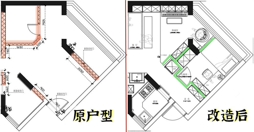 灵感参考:对于不规则户型,要考虑的不是某个空间的布置,而是整个户型的重构,对不合理墙体的重新梳理,才能实现最佳的空间利用。