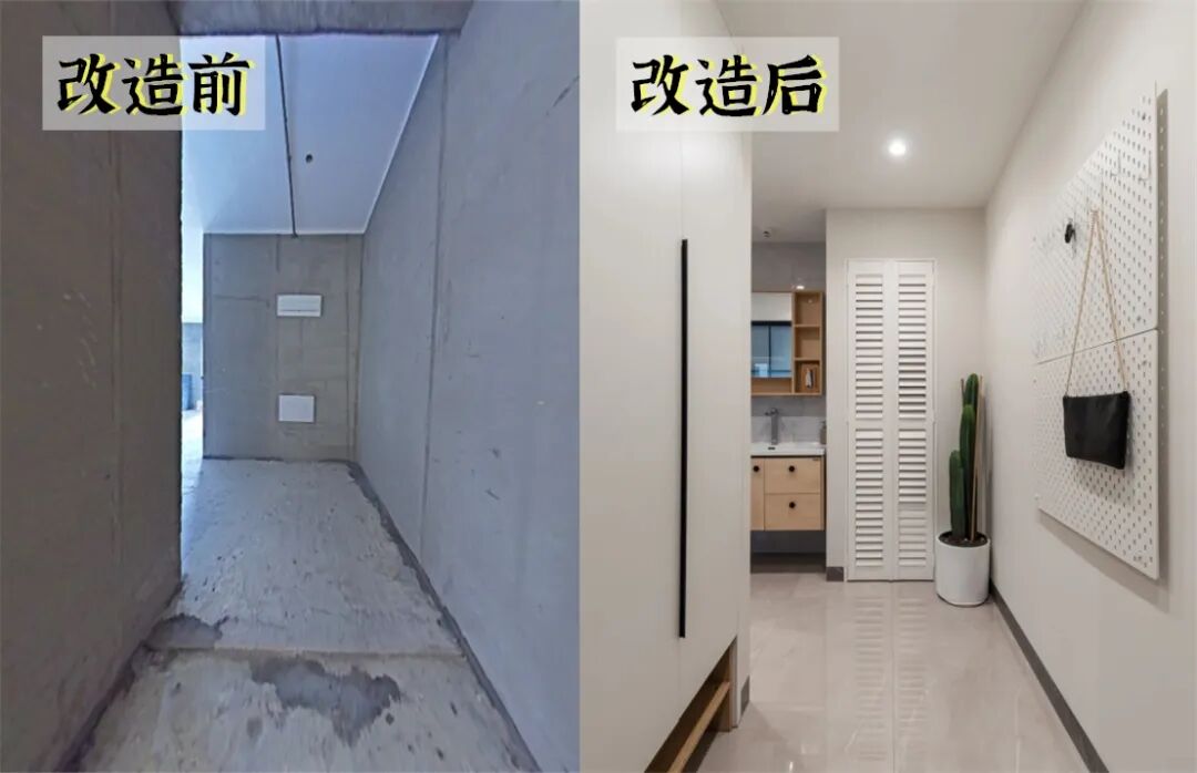 改造思路:拆除玄关附近的非承重墙,改成嵌入式鞋柜柜。同时向厨房借用部分面积,把卫生间洗手盆外置过道,避免早上洗漱排队;并在洗手盆旁边做了一个“800库”,解决婴儿车、儿童自行车的收纳问题。