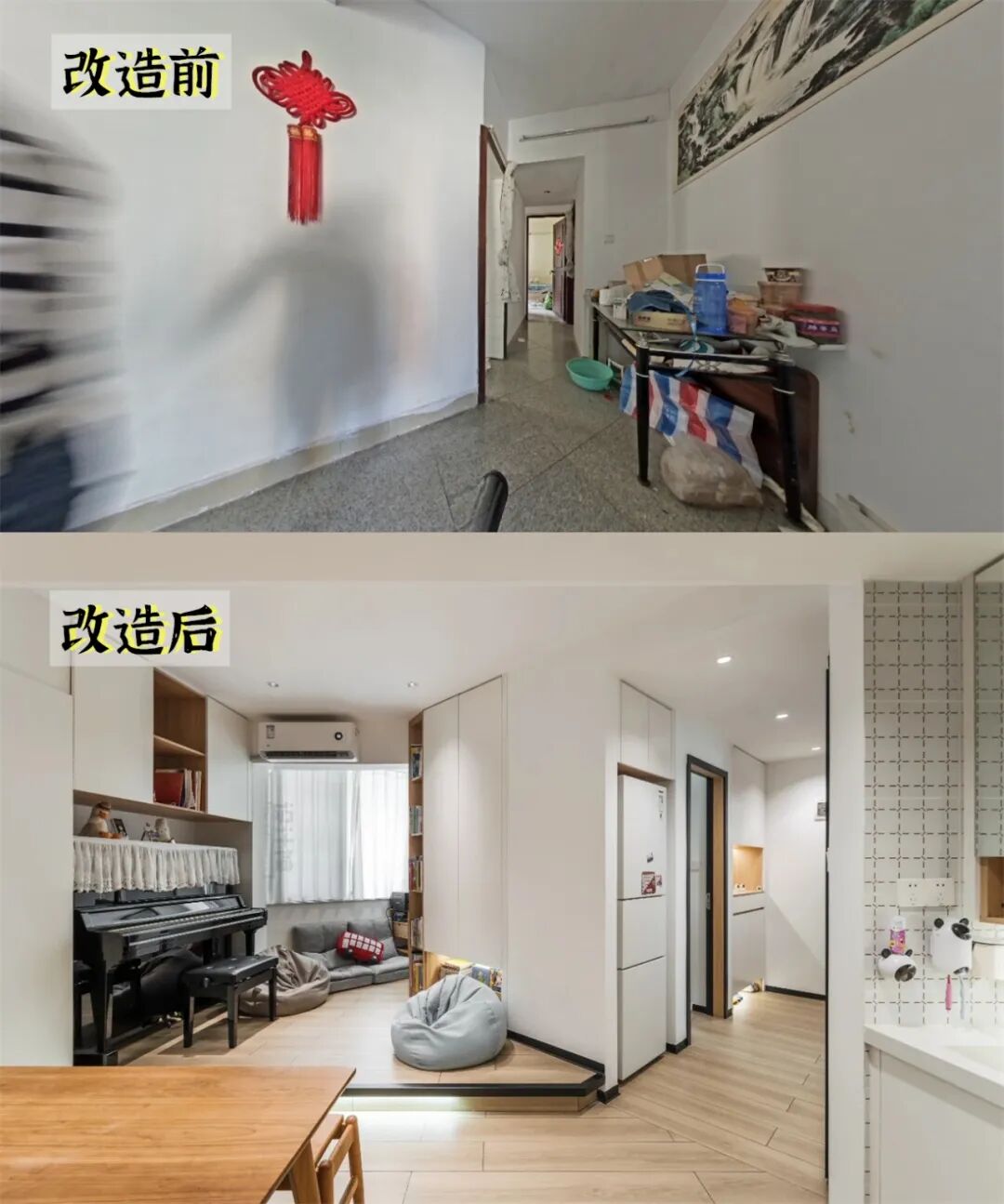 改造思路:通过拆除厨房或入户之间的非承重墙体,向厨房“借”出一个玄关区域。打造了一个大大的鞋柜,既满足了收纳需求,又通过屏风形成了一个视觉缓冲区,实现“藏”与“露”的美学平衡。