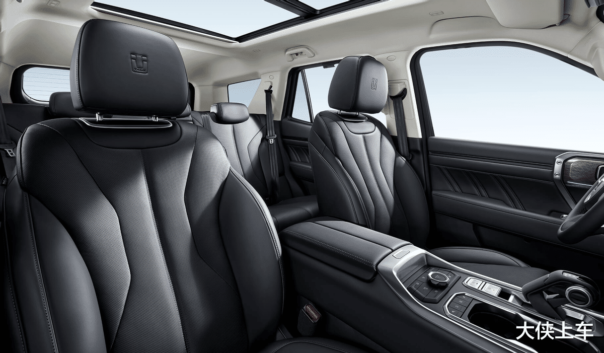 把目光转移到车内,大家会发现坦克400 Hi4-T的座舱设计,除了使用与外观相呼应的铆钉、镀铬等较为狂野的设计元素进行点缀外,其实整体还是偏向于豪华科技。