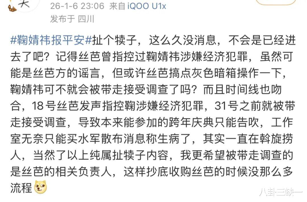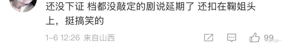 但说一千道一万,把矛头对准鞠婧祎的最多,她和丝芭的纠纷正处在风口浪尖,不少网友觉得,丝芭都实名举报了,平台怕踩雷、想避险也合理,之前又不是没有过类似纠纷导致剧集延播好几年的先例。甚至由此衍生出一些更无厘头的猜测,什么“软封杀”啊,什么“风险艺人”啊,什么“已经被带走调查了”啊,怎么脑洞大开怎么来。