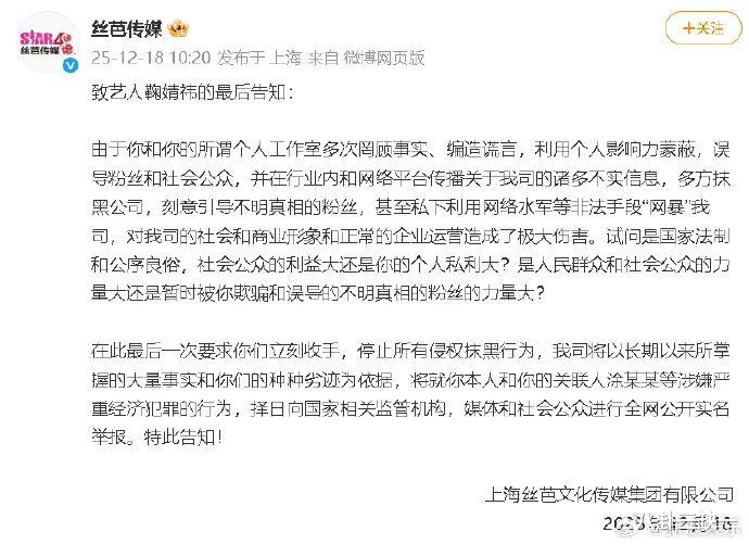 双方彻底断绝协商可能,是2025年12月18日,丝芭再度加码,发布《致艺人鞠婧祎的最后告知》,宣布将实名举报她及关联人涂某某涉嫌“严重经济犯罪”。一纸报警回执,直接将纠纷从合约问题推向了更严重的刑事法律层面。