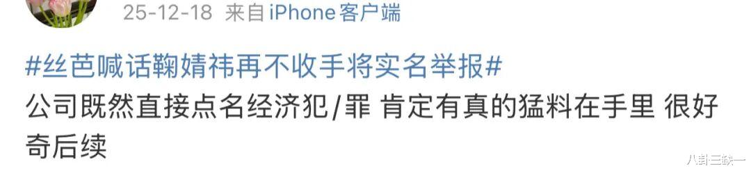 粉丝自然是全身心信任偶像的,在丝芭官博评论区一边怒斥“你是黑社会啊?”、“别占用公共资源了”、“没有鞠婧祎谁知道你是什么东西”,一边催促“有冤情去法院”、“真占理就快点告”、“有本事开庭别撤诉”。