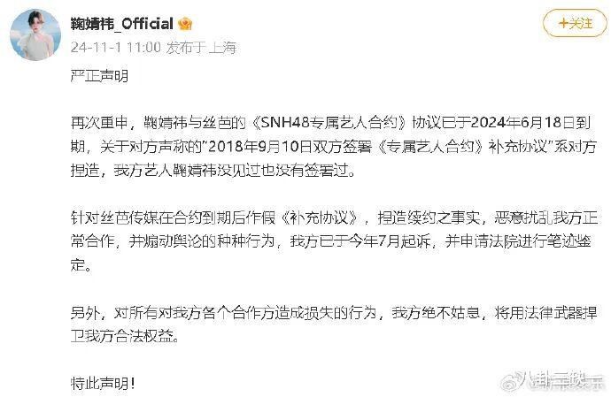 到2024年11月,丝芭起诉《新视线》《精品购物指南》等与鞠婧祎合作的第三方,主张自身享有独家经纪权,要求下架相关物料并索赔30万元。