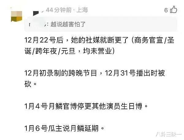 突然这么彻底地消失,还是在合约纠纷、新剧待播的关键节点,本来就容易引发争议啊。何况还正好赶上跨年、元旦这种明星必争的曝光节点,很多平时不爱营业的艺人都会出来送祝福、刷存在感,她却啥动态都没发,这合理吗?缺席舞台都没给粉丝个解释,她本人杳无音信,工作室也一声不吭,对接也毫无动静,“身体抱恙”这一说法还是12月29日有狗仔发了个她捂着肚子赶工的视频,大家连猜带蒙拼凑出来的。