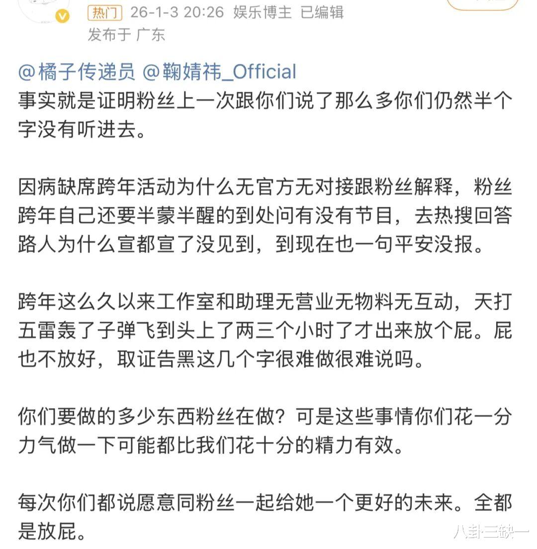 虽然粉丝那边也有统一说法应对,关于B站跨年舞台取消,粉丝澄清并非刻意缺席,而是原本敲定的是合作舞台,鞠婧祎早早完成了部分内容的录制,结果后续合作对象因故无法到场,节目组只能临时调整方案,把合作舞台改成了她的个人节目。原本团队还安排了重新进棚录制的行程,谁料鞠婧祎偏偏赶上身体抱恙,实在没法呈现出一个完美的舞台效果,最后才和平台协商一致,取消了这次演出。