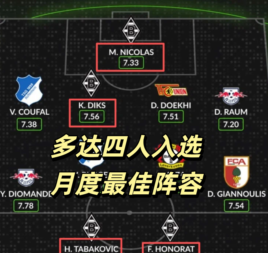 还有个绝佳信号:上月德甲阵容中门兴多达4人入选,包括门将尼古拉斯、主力中卫迪克斯、锋线上的塔巴科维奇以及霍诺拉特,球队如今已非“吴下阿蒙”。