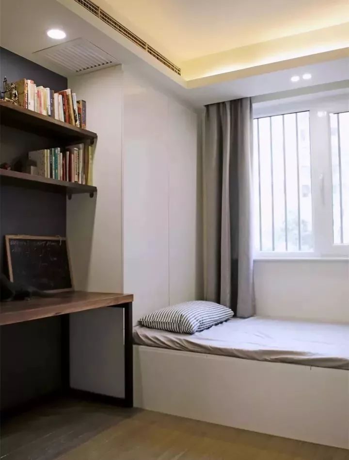 现在最流行的榻榻米的设计,就是把榻榻米连着衣柜来一起做,把整个房间都给用上,尾巴是衣柜,正常卧室的长度都足够做这样的设计。