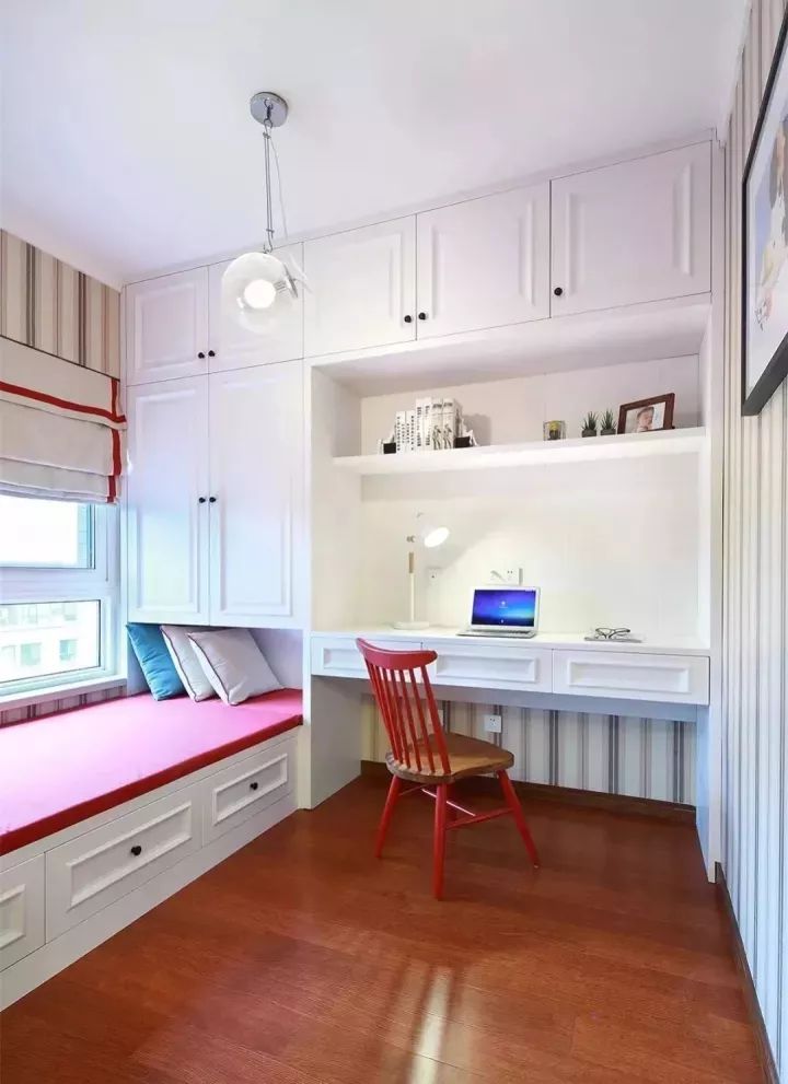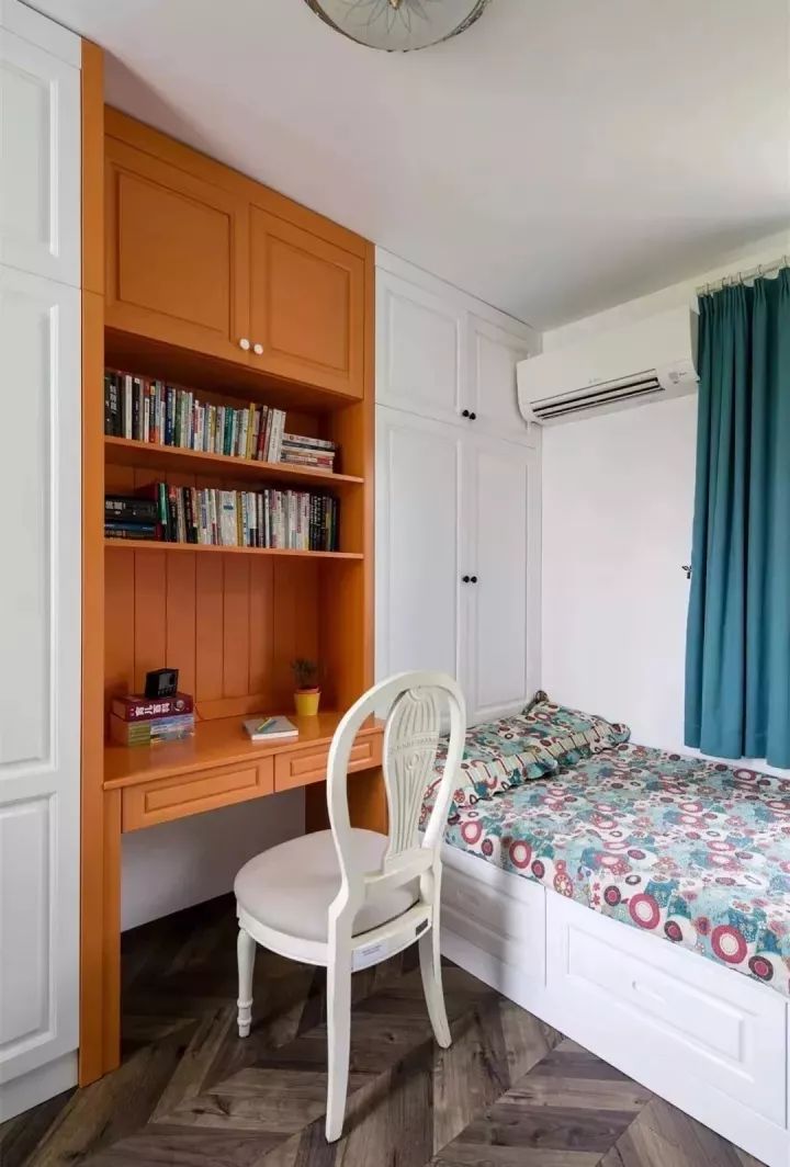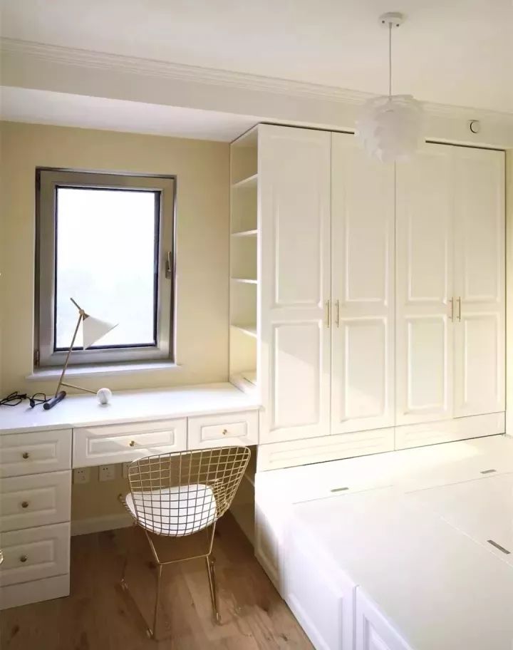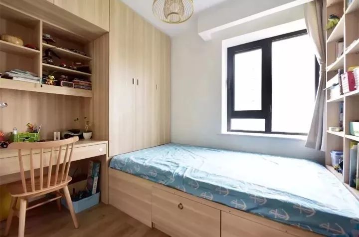 然后有很多也会把书桌柜给结合起来,在衣柜的边上延伸出几块隔板作为书架,底下就可以放书桌啦,像是儿童房就很适合这样做,毕竟孩子平时需要个安静的读书角。