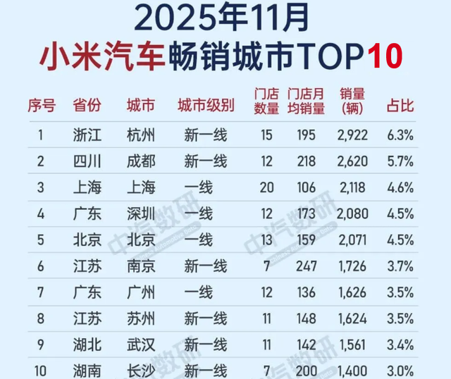 前10大城市占比没有超过40%,可见小米汽车在前10大城市的销量占比更高一点。