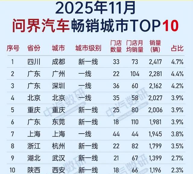 再看看问界汽车,下图也是11月份,销量最高的10个城市排行榜。