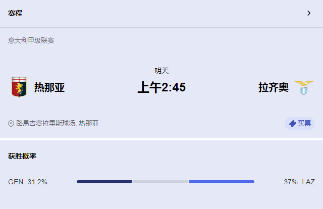 胜负与比分预测综合各方因素,这很可能是一场沉闷而激烈的对决。热那亚将依靠坚固防守寻求反击机会,而拉齐奥则会努力控制中场,寻找难得的进攻灵感。