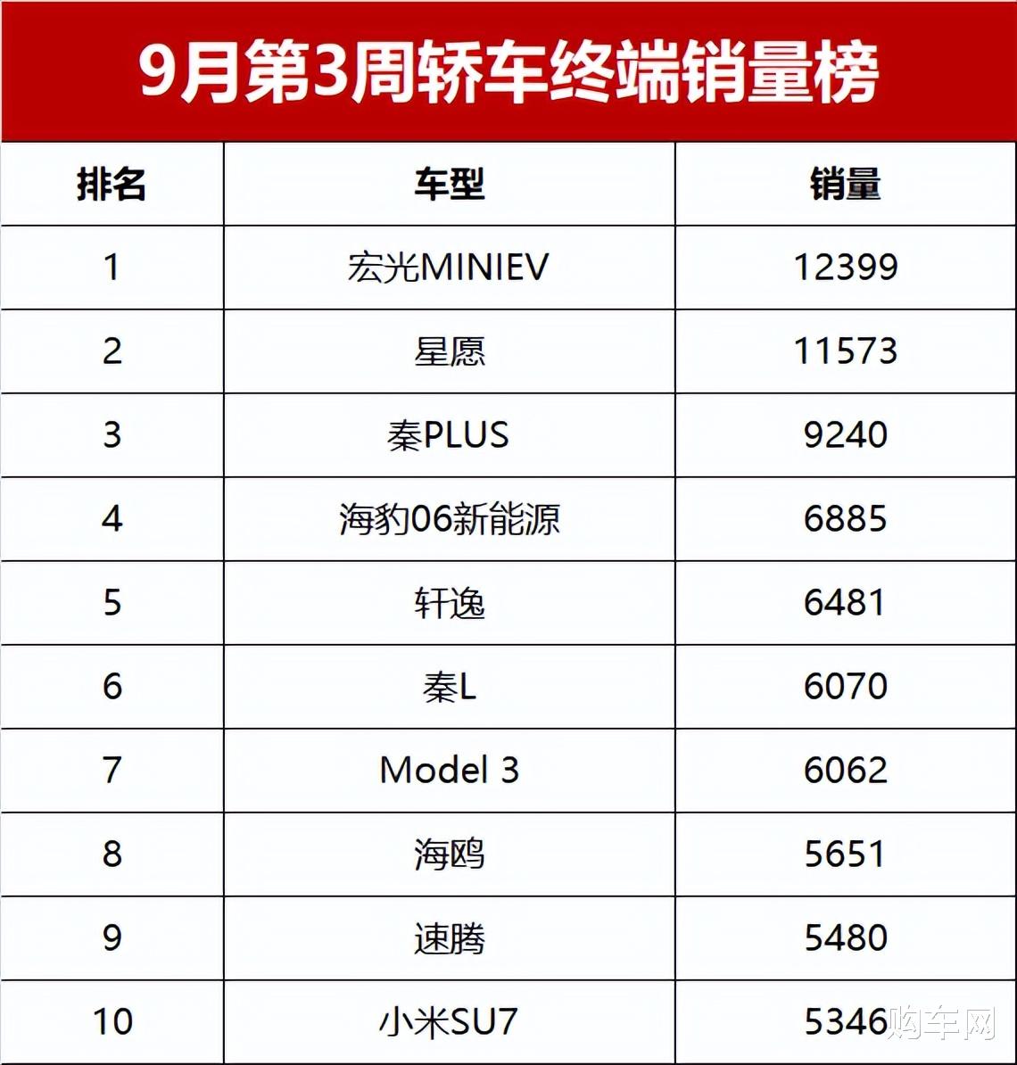 与上周相比,本周销量排名前三的车型保持不变,宏光MINIEV以12399辆的销量夺得轿车周度销量冠军,这也是这款新车连续三周位列轿车销量榜的榜首位置。星愿和秦PLUS依然位居第二和第三位,本周销量分别为11573辆和9240辆。作为星愿对手的海鸥本周销量只有5651辆,排名第八位。