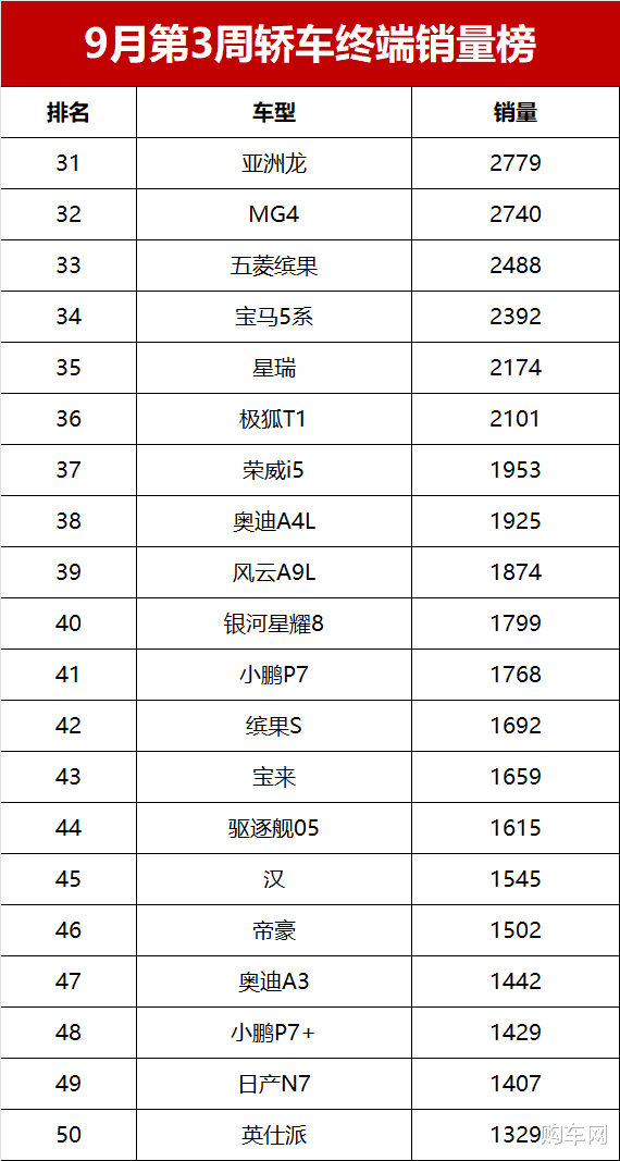 宝马3系仍是豪华中型车销量冠军,9月第三周终端销量3441辆,排名第二十位。奔驰C级和奥迪A4L销量分别为2941辆和1925辆,排名第二十七和第三十八位。