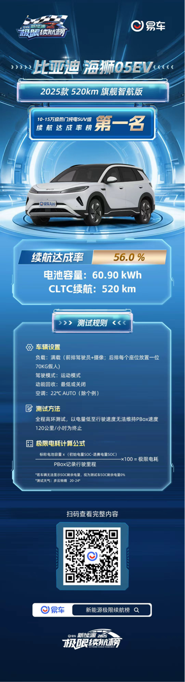 在近期由易车主办的2025新能源极限续航测试中,纯电动车组的测试结果出炉,引起业界的广泛关注。其中,比亚迪海狮05EV凭借56.0%的续航达成率,强势斩获10-15万级热门纯电SUV小组续航达成率榜冠军,击败一众同级热门车型。这一成绩,是对海狮05EV技术实力的权威认可,更印证了其扎实的续航表现。