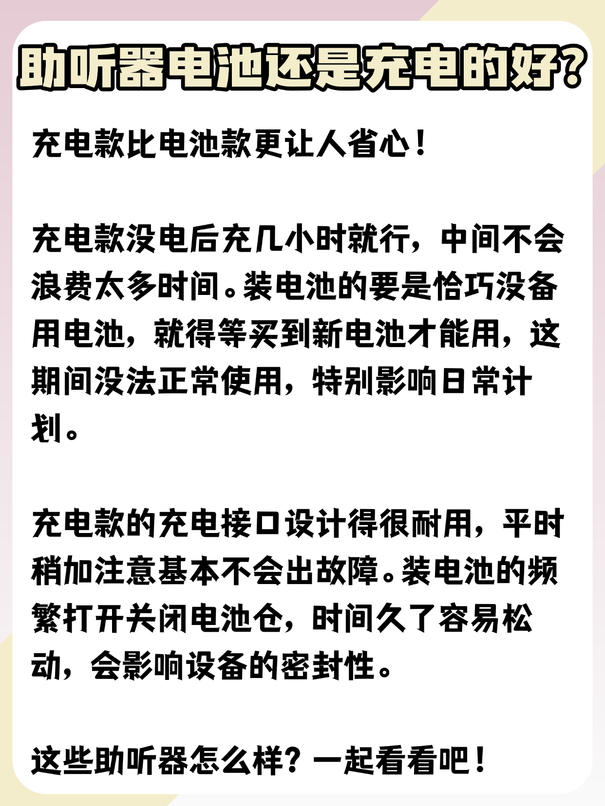选助听器别只看价格!充电款和电池款性价比对比,帮你避免踩坑。真正的性价比要看长期使用成本:电池款初期便宜,但要持续买替换电池,还容易因电池仓松动影响使用寿命;充电款一次投入,后续只需充电,接口耐用性强,使用周期更长。另外避坑重点:别贪便宜选电池仓设计简陋的款式,容易漏风影响使用。