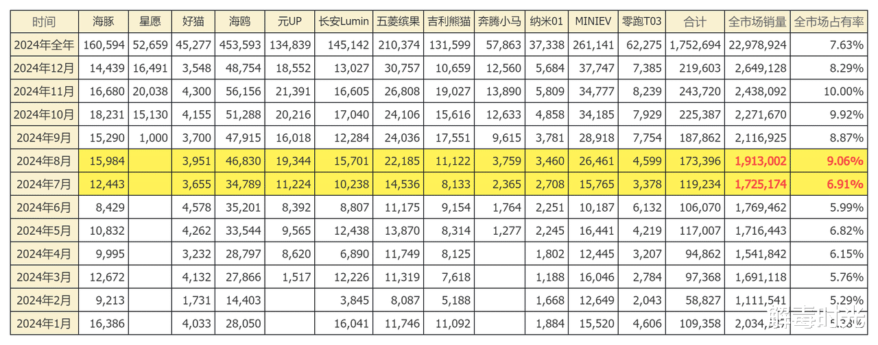 这两个政策之间,对于购买新能源的用户来讲,恰好有着1万元的补贴差异,对此我们把目光投向受这个刺激最大的10万元以内的纯电车市场,挑出海豚、海鸥、星愿、五菱缤果等12款小车,构成一个小的细分市场模型。恰好可以发现,在2024年7-8月,总体销量从119,234增长到173,396,增量在45%左右。