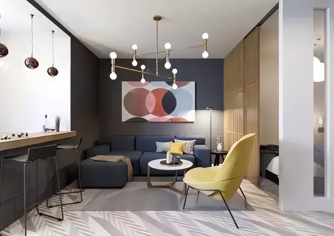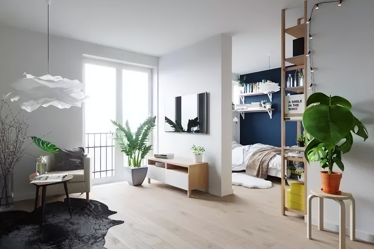 单身公寓常是客厅与卧室相连,别做全隔断,用 “半隔断” 更显大: