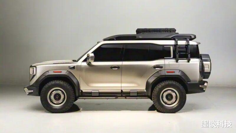 从官方发布的图片来看,新车配备突出的轮眉拱设计、大型越野轮胎及车顶行李架。车顶疑似搭载激光雷达传感器,预示其可能具备高级驾驶辅助功能。车身采用非承载式结构,强调越野使用场景下的刚性需求,预计将配备三把差速锁以提升复杂路况下的通过性。