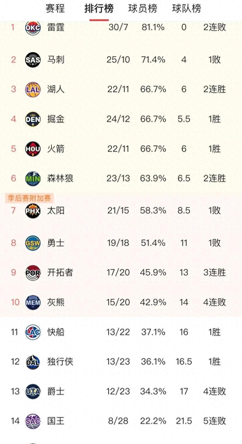 其他赛果方面,掘金在加时赛中绝杀了76人,恩比德空砍32分10篮板;勇士102-103惜败快船,库里得到27分,小卡贡献24分12篮板。目前勇士19胜18负排在西部第8,太阳21胜15负位列西部第7。