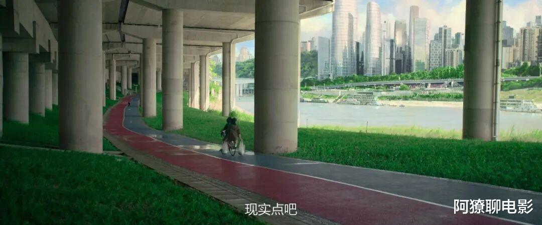 路空文与小橘子骑行通过的是江北区(现两江新区)北滨路桥下空间,背景是江对岸的陆海国际中心(嘉陵帆影)。