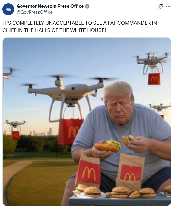 加州州长办公室在X上的官方账号,随后也对特朗普的体重进行了抨击,并附上一张AI生成图片,照片中特朗普手里拿着两个麦当劳汉堡,而多架无人机则将一袋袋快餐送到特朗普的手中,贴文写道:在白宫大厅里看到一位肥胖的三军统帅是完全不可接受的!