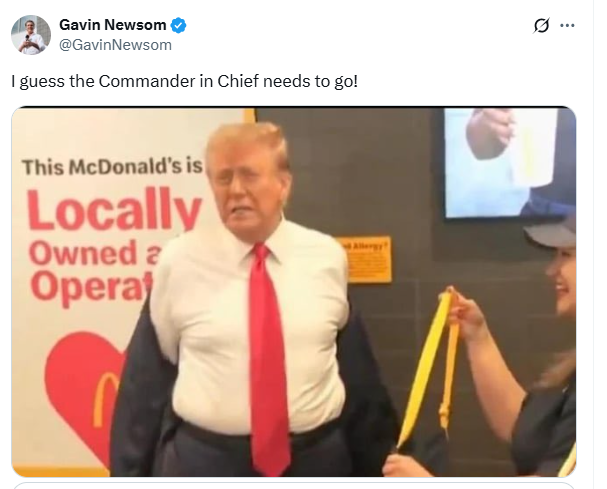 “看来三军统帅得先走人了!”纽森在社交平台X上发帖回应赫格塞思对美军将领讲话的片段时说道。他还附上一张去年10月特朗普竞选时在麦当劳拍摄的照片。