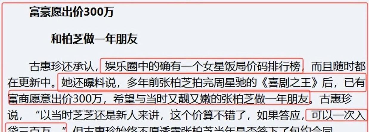 古惠珍就说啦,按道理说张柏芝那时候还是个新人呢,这个价钱已经算挺高的了,要是答应的话,一下子就能赚三百多万。不过嘛,古惠珍对张柏芝到底有没有答应被“包养”这事呢,就吊起了大家的胃口,就是不肯明说她最后到底是怎么决定的。但是呢,为了不搞砸自己在圈子里的名声,古惠珍也亲口承认啦,在娱乐圈里确实有这么个女明星吃饭局的价目表,而且这个价目表还会随时更新呢。港圈饭局女王的翻车现场