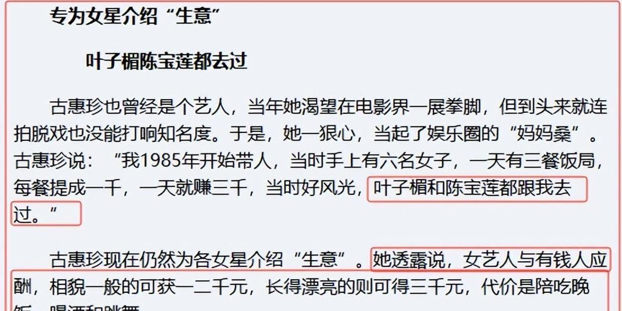 古惠珍说啊,她干得最多的事儿就是吃完饭后跟大家一起跳舞,跳着跳着就被别人趁机动手动脚的,不管暗地里还是明面上,最后跳完一场能收一千块钱。尝到了这个甜头之后,1985年的时候,31岁的古惠珍就想着要干点更大的事情了。她开始组织一些人一起去参加饭局,专门去劝那些刚入行、家境不好、跟她一样想挣快钱的年轻姑娘去“吃饭识人”。港姐堕落:从冠军到风月中介
