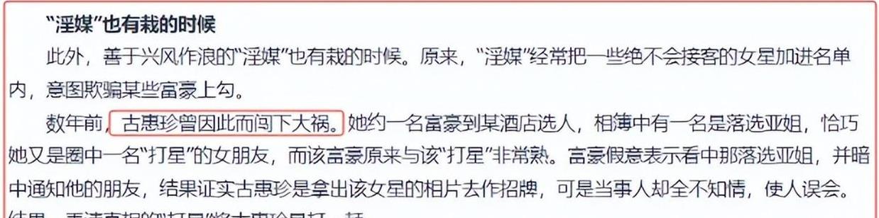 那时候啊,大家根本没见过什么饭局价码榜单,都以为古惠珍又在搞什么神秘把戏呢。古惠珍担心自己的名声受损,还想继续拉生意,所以老爱吹牛,把一些根本不接客、特别有原则的女明星也塞进名单里。有一次,这事居然玩脱了,被某个“打星”一顿暴揍!有一天,有个大富豪偏偏看上了这个很有骨气的女明星,她还是个落选的亚姐呢,而且当时还是圈里一个“打星”的女朋友,俩人正处得火热。没想到啊,这富豪跟那个“打星”关系挺铁的,知道他跟落选亚姐正在谈恋爱,于是就假装对这个落选亚姐感兴趣,想跟古惠珍聊聊。其实呢,富豪背后偷偷通知了“打星”,想让他去现场抓个现行。结果,“打星”火急火燎赶过去的时候,古惠珍实在瞒不住了,只好承认自己只是用这张落选亚姐的照片当幌子,骗富豪上钩,并没有女星的真实联系方式。这下可好,这位女明星也被坑进去了,完全不知道发生了啥。“打星”明白了事情的真相后,气得不行,使出了浑身解数,把古惠珍狠狠揍了一顿,看看你还敢不敢再乱来!古惠珍被揍得有点怕了,从那以后做事特别小心。她给别人牵线搭桥的时候,也会特意先问问那个女明星是不是单身,就怕又惹上什么麻烦,再被哪个女明星的男朋友追着打。