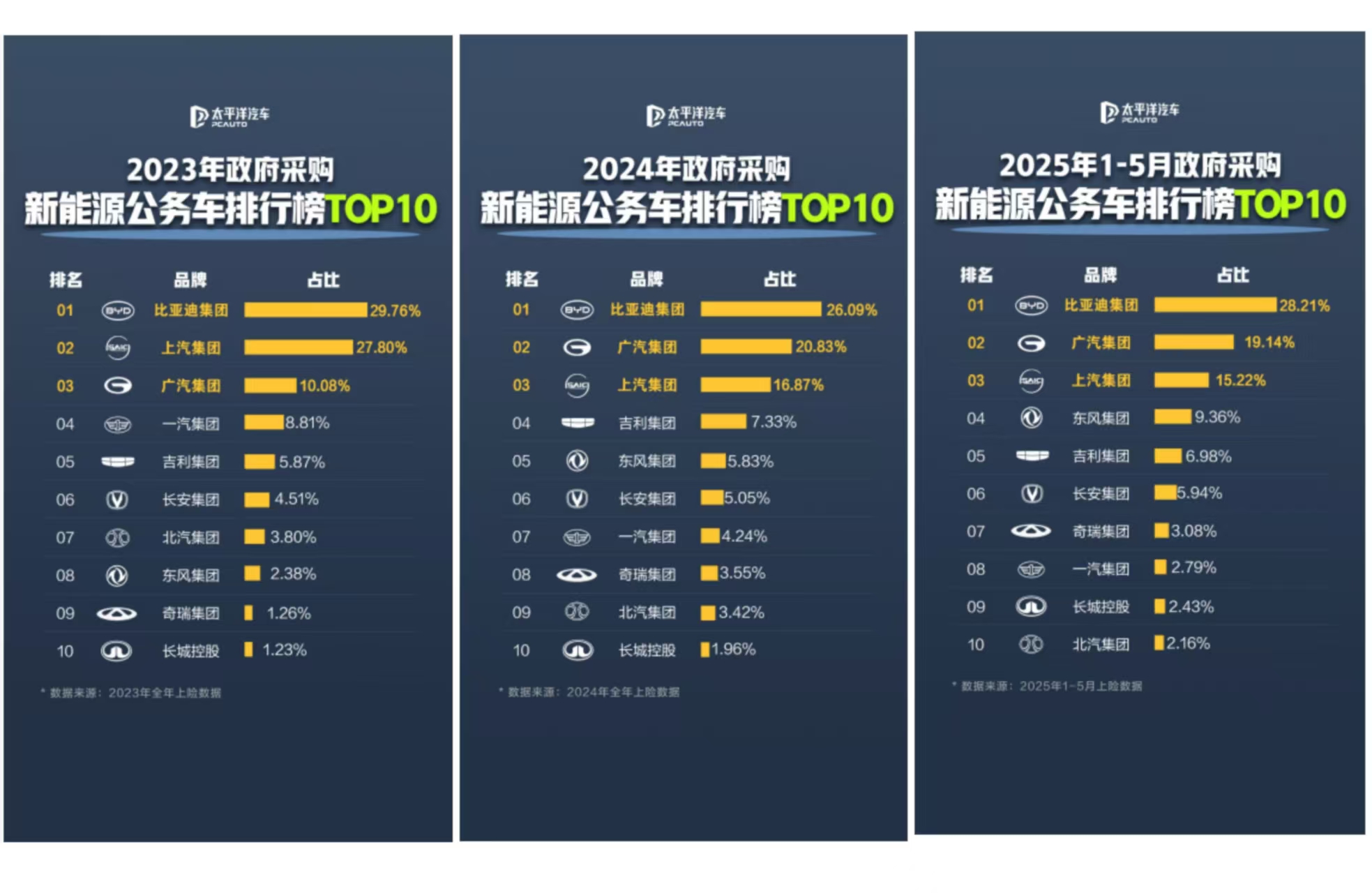 近日,太平洋汽车发布2023-2025年政府采购新能源公务车榜单。数据显示,比亚迪连续2年成为政府采购新能源公务车冠军,今年1-5月仍旧保持大幅领先。