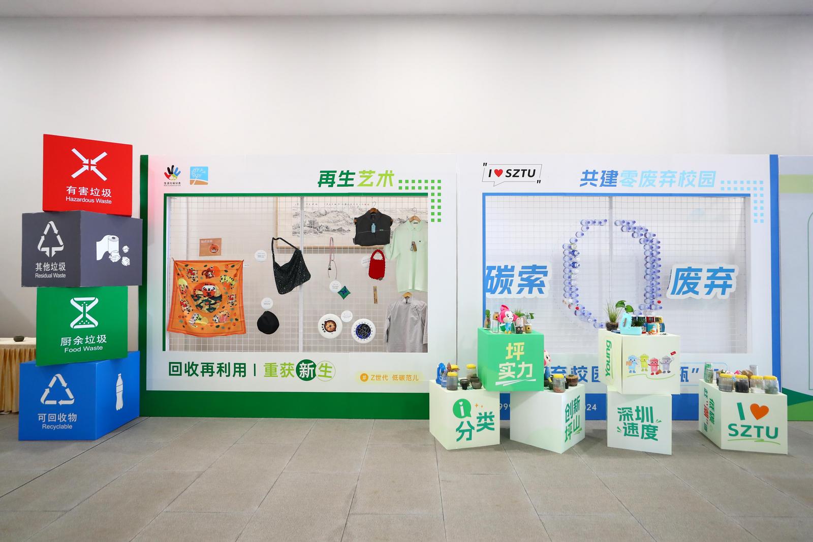 最后,与会领导嘉宾来到深圳技术大学图书馆参观了再生产品艺术展区,并体验了可回收物智能回收箱。值得注意的是,智能回收箱是坪山区积极响应“零废弃校园”做出的生动实践,联合环保科技企业,在学校试点投放智能回收箱,旨在促进校园可回收物的资源化再利用,推动垃圾源头减量、精准分类与高效回收,逐步建立以学校为单位的回收物品溯源体系。
