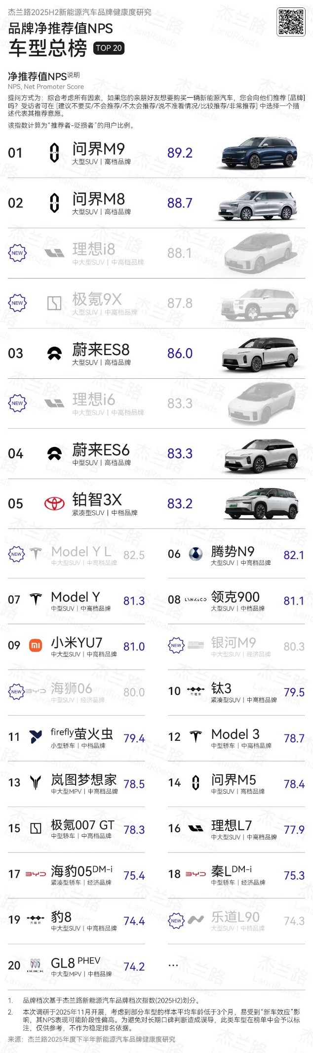 近日,杰兰路咨询发布《2025下半年新能源汽车品牌健康研究报告》。报告显示,问界荣获品牌NPS(净推荐值)第一、品牌发展信心指数第一、30万元以上品牌百人青睐指数第一;