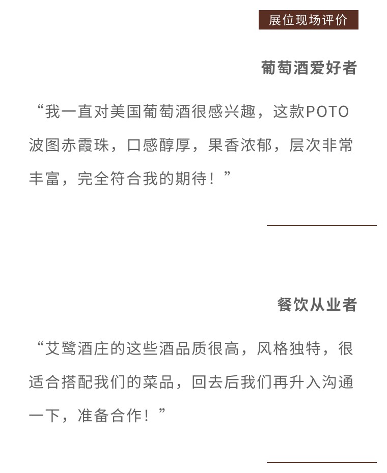 艾鹭酒庄源自美国加州,我们一直致力于成为更了解中国味蕾的酒庄。此次活动是一场美国葡萄酒与中国葡萄酒文化的激情碰撞与交流的盛宴,同时也共同探索葡萄酒文化的无限可能。艾鹭酒庄的展位前,更是人头攒动,热闹非凡。有来自各国的资深品酒达人、酒商(采购商),也有初涉葡萄酒领域的新手、餐饮从业者和普通消费者。大家端起酒杯,轻轻摇晃,细细品味。