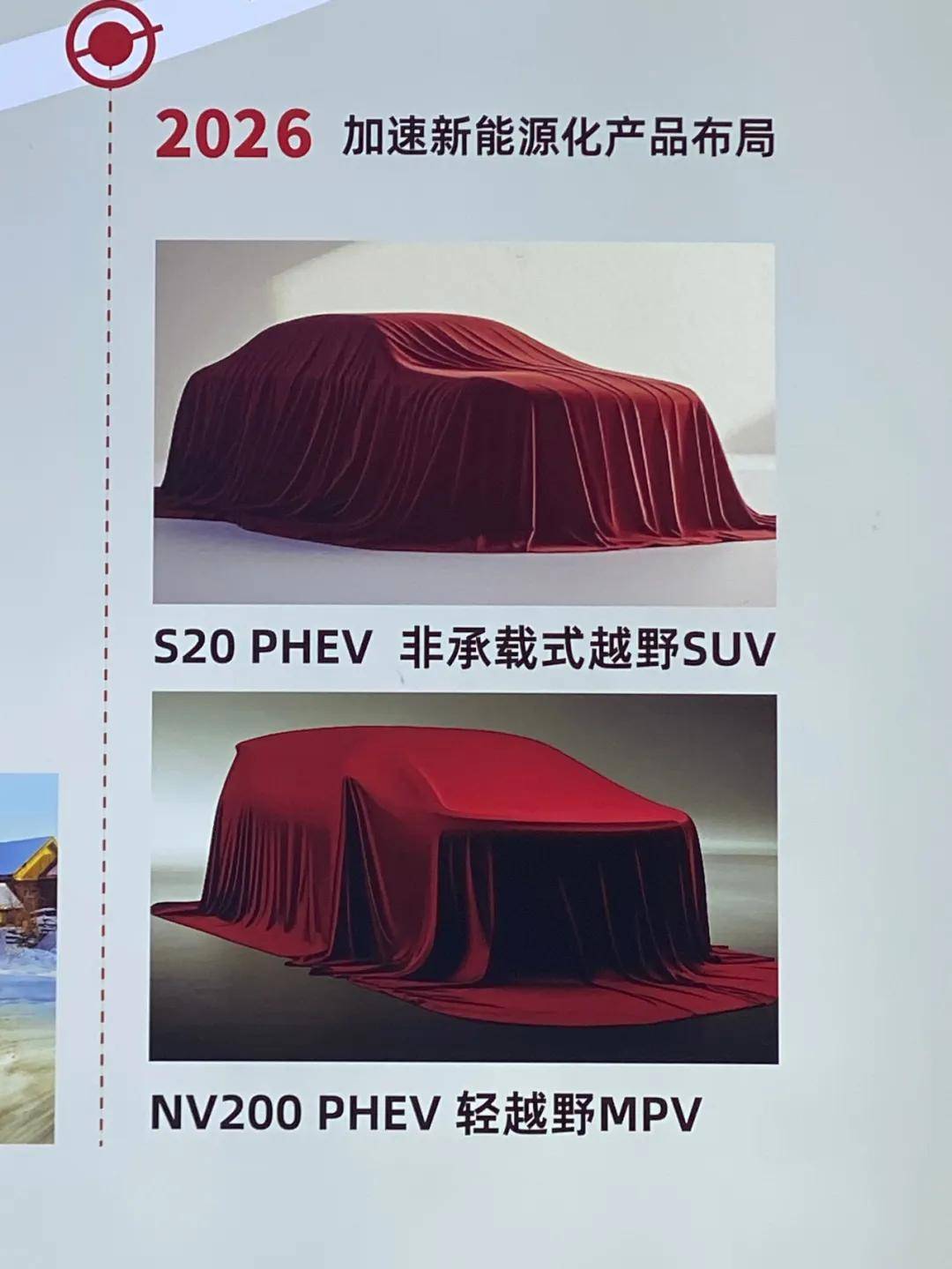 但愿好饭不嫌晚。Frontier Pro作为日产首款由中国主导设计、研发、生产同时面向全球市场的皮卡,媒体试驾后得到好评,也有PHEV插电混动版本,而在2026年产品规划介绍时,一款代号为S20 PHEV的非承载式越野SUV也赫然在列;另外,NV200 PHEV版本也在2026年上市产品规划中。NV200作为一款MPV一度是销售火热的车型,明年将推出插电混动版本,也足见郑州日产在产品序列上陡然提速。