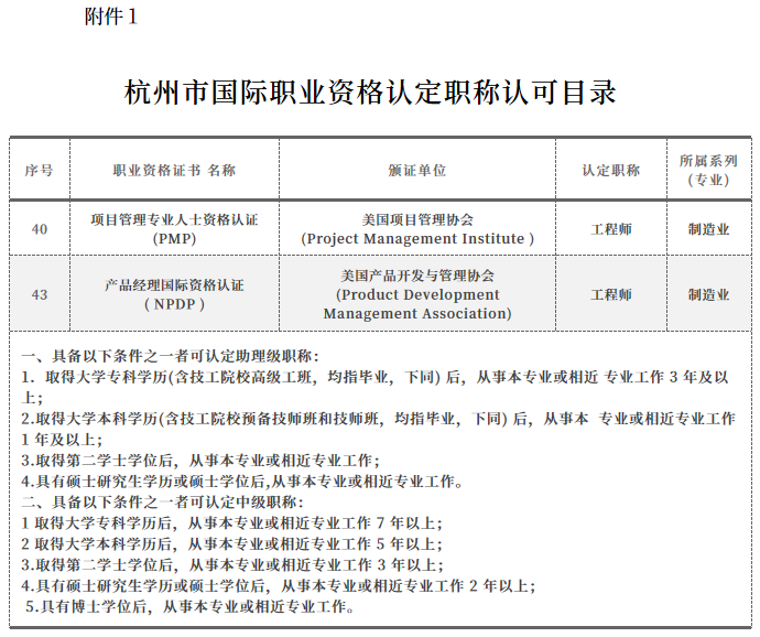 杭州将PMP证书纳入国际职业资格认定职称认可目录,持证者可申请认定助理级和中级职称。同时,具有中级专业技术职称的PMP持证者(45周岁以下),在杭落实工作单位并缴纳社保后,可办理人才引进落户。