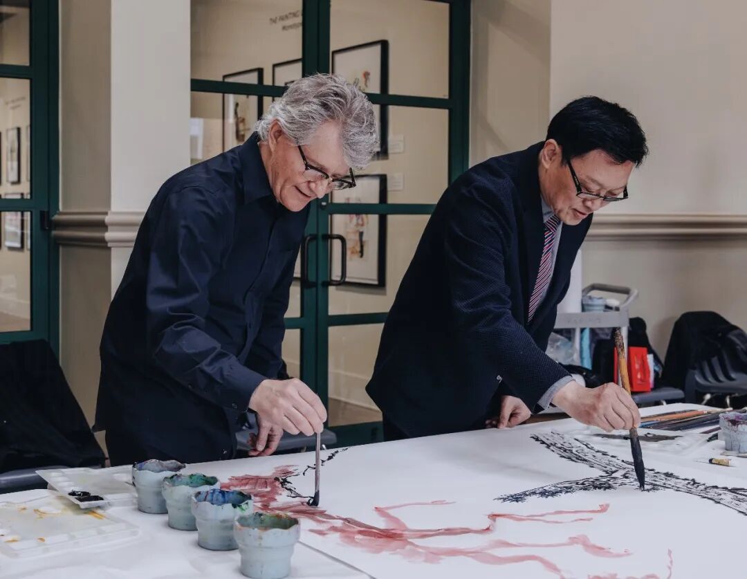 高云率先开笔,并在创作现场向现场观众阐释主题内涵,“松与树相向,象征着友谊长青,石与竹相伴,代表着坚定而清虚,这是中美民间交往的精神期许;作品尽显美好愿景与人类共同的追求。”罗伯特·格林紧随其后,以西方色彩晕染技法用朱红与土黄勾勒岩石肌理,光影与点线对比间让作品的厚重遒劲跃然纸上,实现东方写意与西方写实的巧妙融合。
