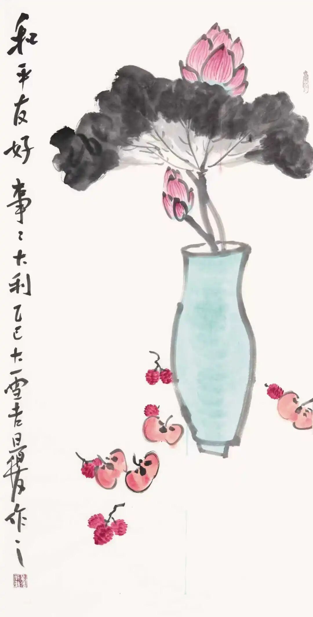 据介绍,《和平友好 事事大利》是跨文化艺术表达的作品。画中瓷瓶与盛放的莲花,谐音荷”即“和”、“瓶”即“平”,寄托和平的祝愿;而四枚红柿与九颗荔枝则谐音“柿”即“事”、“荔”即“利”,寓意事事顺利。作品既保留中国画传统韵味,又融入当代审美与国际视野。