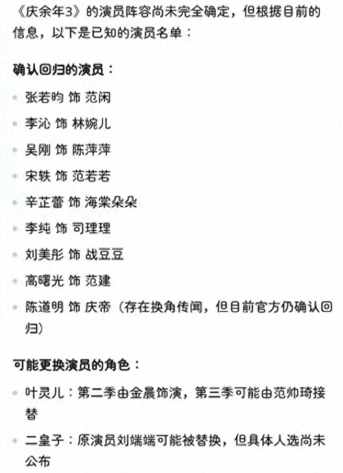 三、庆 3 阵容大起底:原班回归+新面孔,这波稳了?张若昀敢剧透,底气全来自《庆余年3》的硬配置!官方早就官宣原班人马回归,张若昀稳坐范闲C位,陈道明、吴刚等老戏骨悉数在场,哪怕叶灵儿换角成范帅琦,也丝毫不影响期待值。更重磅的是新角色阵容:胡军演四顾剑、张彬彬演夏栖飞,现在再加上张维伊小队,这是要把权谋局拉满啊!
