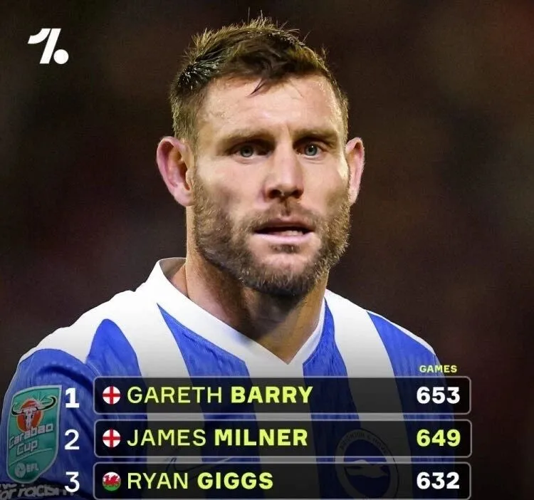 目前,英超历史出场纪录由加雷斯·巴里保持,他为653场。对于刚刚度过40岁生日的米尔纳来说,4场的差距已是触手可及。只要保持健康,他极有可能在未来一个多月内就完成对传奇的超越,将自己的名字独一无二地刻在英超历史的丰碑上。