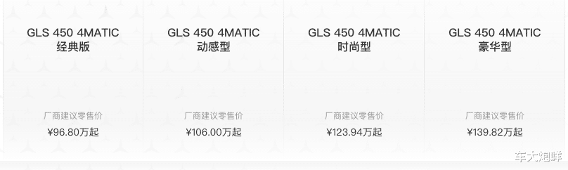 12月15日,笔者从梅赛德斯-奔驰官网获悉,奔驰GLS 450 4MATIC经典版现已正式上市,官方指导价96.8万元。该车可以视为奔驰GLS车系的全新入门车型,采用2.5T直列六缸发动机与9速自动变速箱的动力组合。