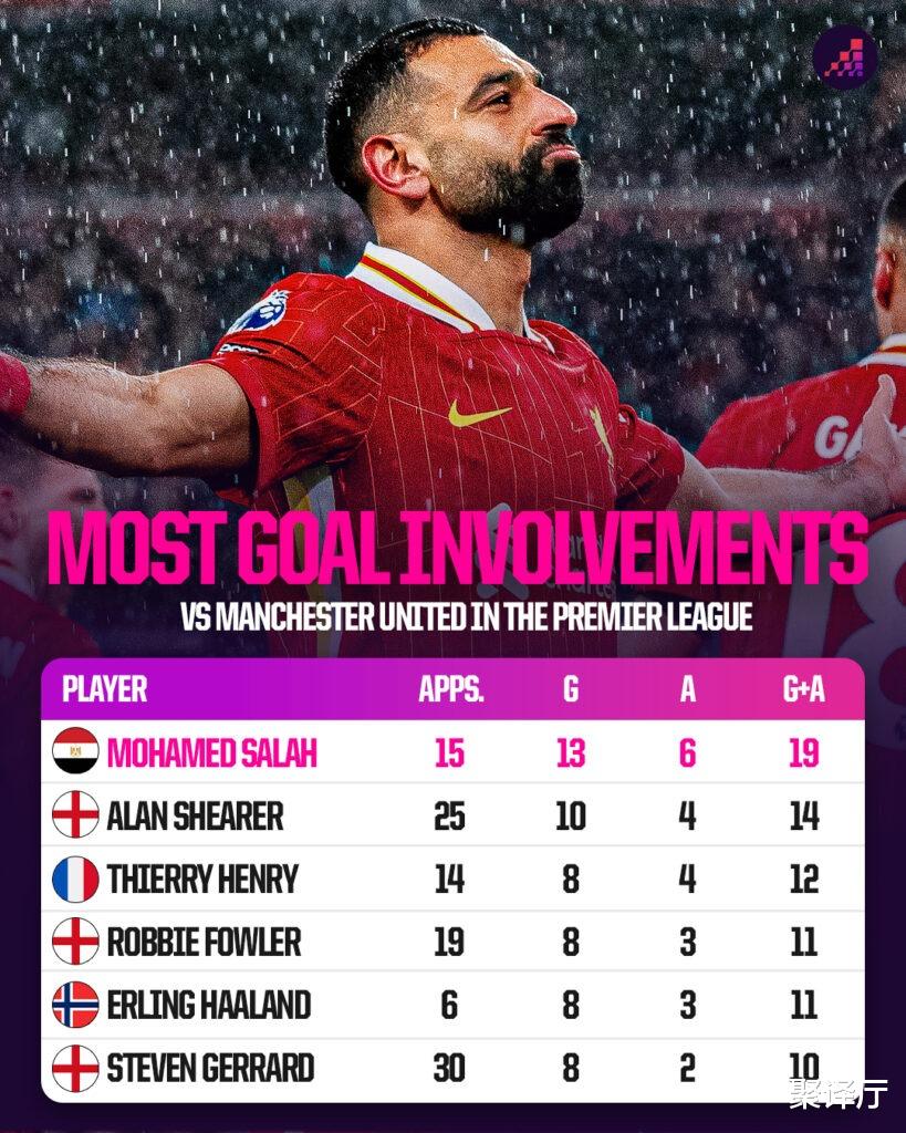 萨拉赫在英超历史上对阵曼联的进球达到13个,参与进球19个,冠绝英超。如果能在周日的双红会上进球,他将成为英超历史上第6位在对阵单个对手时参与进球达到20个的球员。