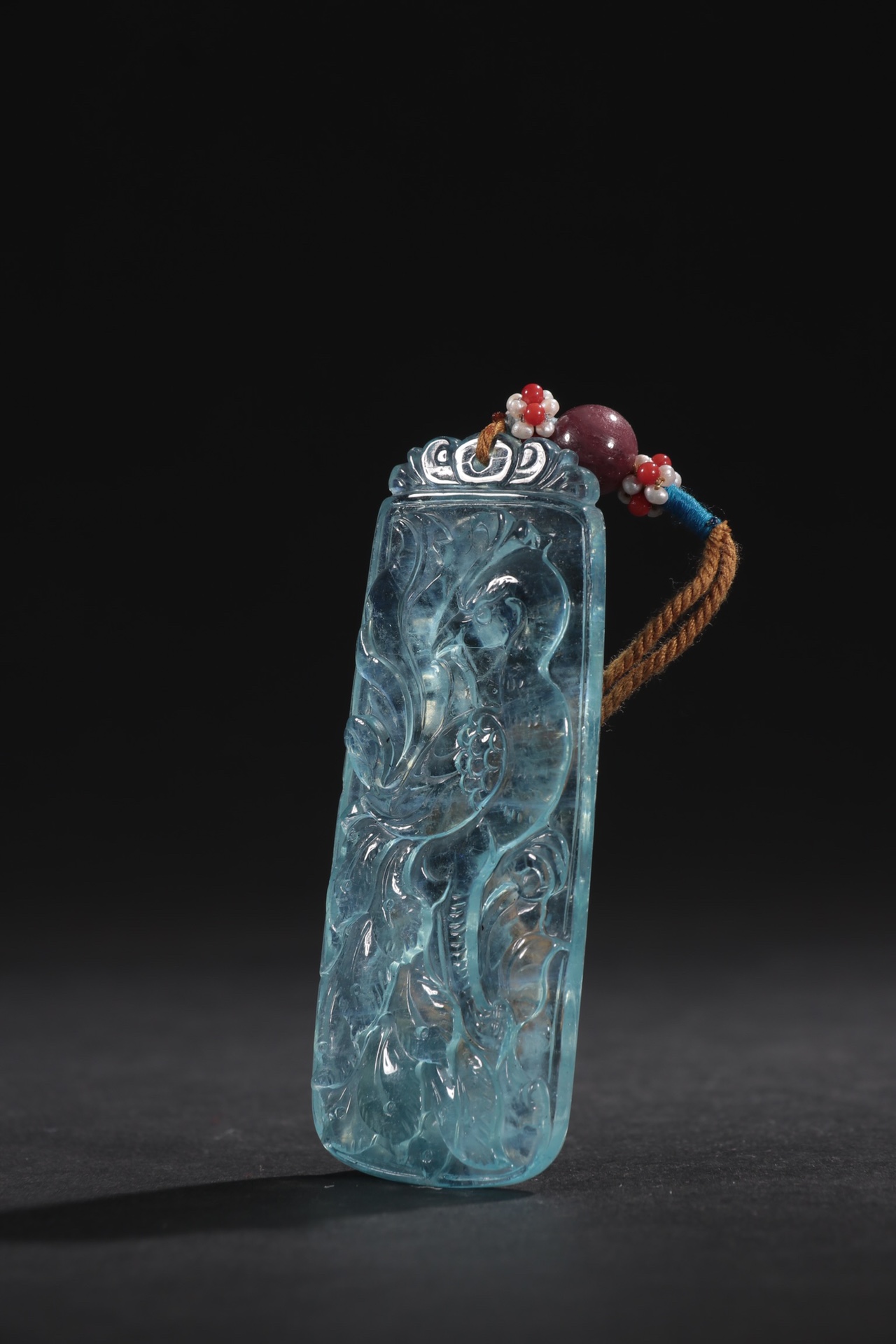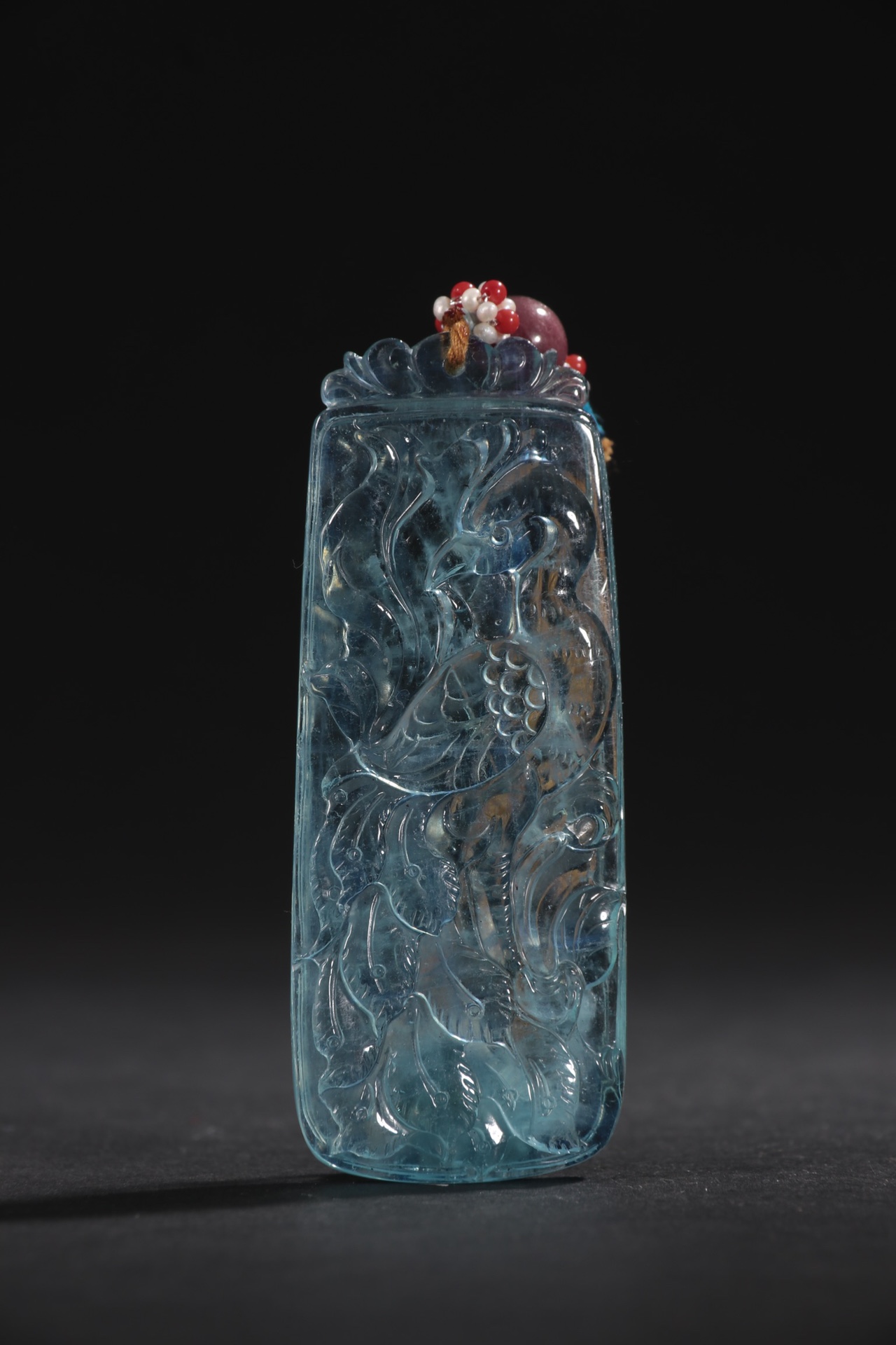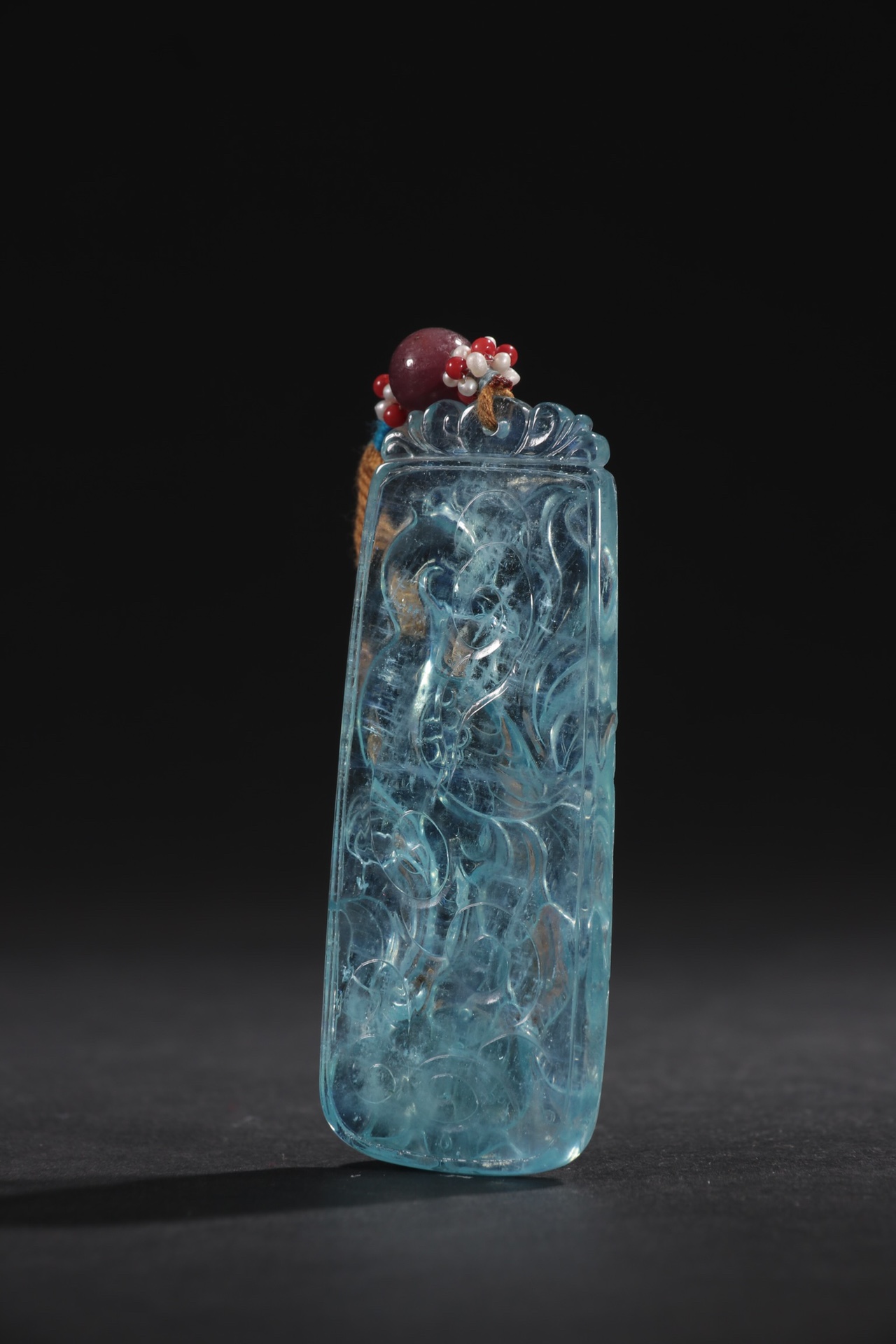 旧藏-海蓝宝石“凤凰纹”佩牌 规格:高8cm长3cm厚0.7cm重37g 天然海蓝宝石料,色泽莹润,质地细腻通透,雕刻“