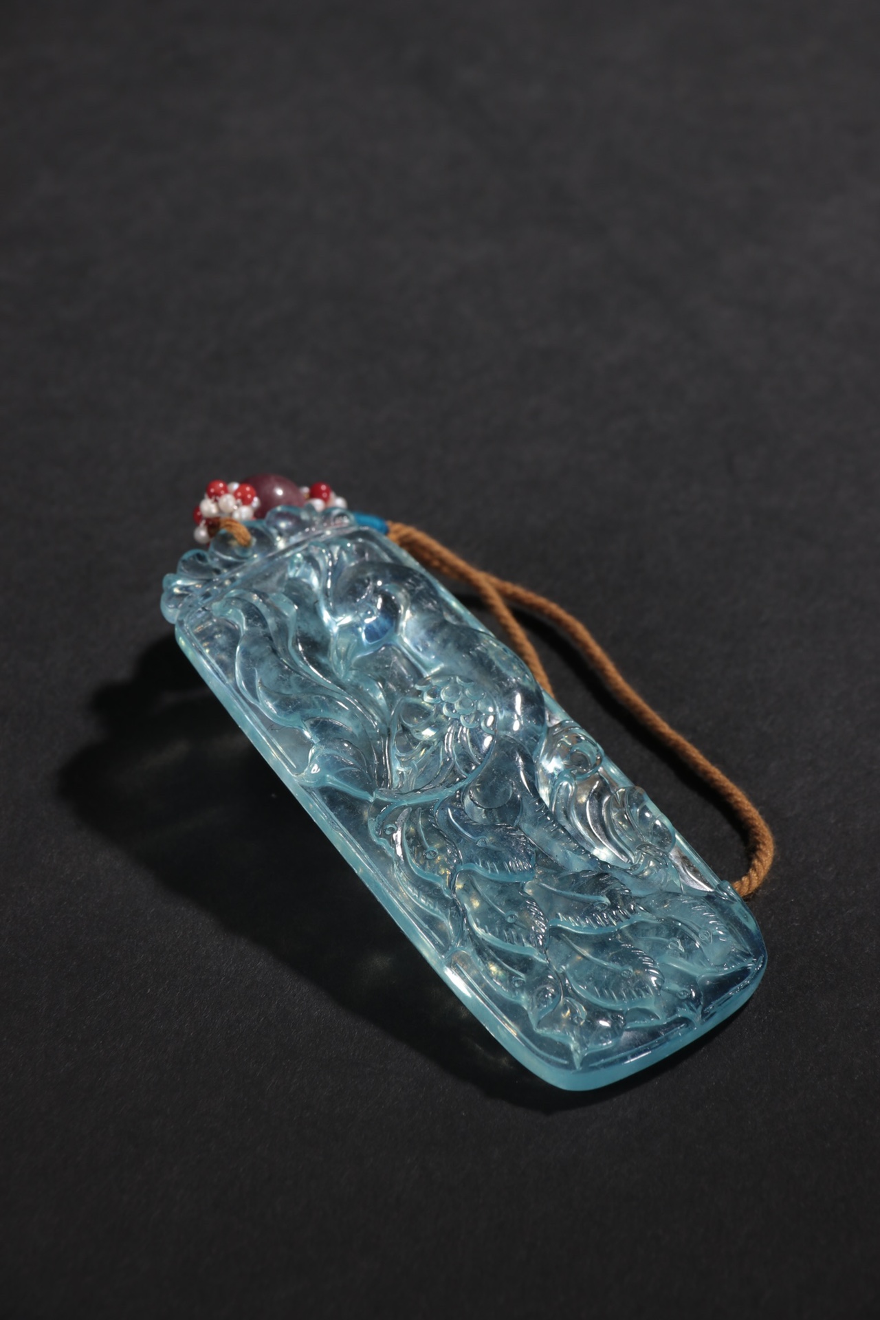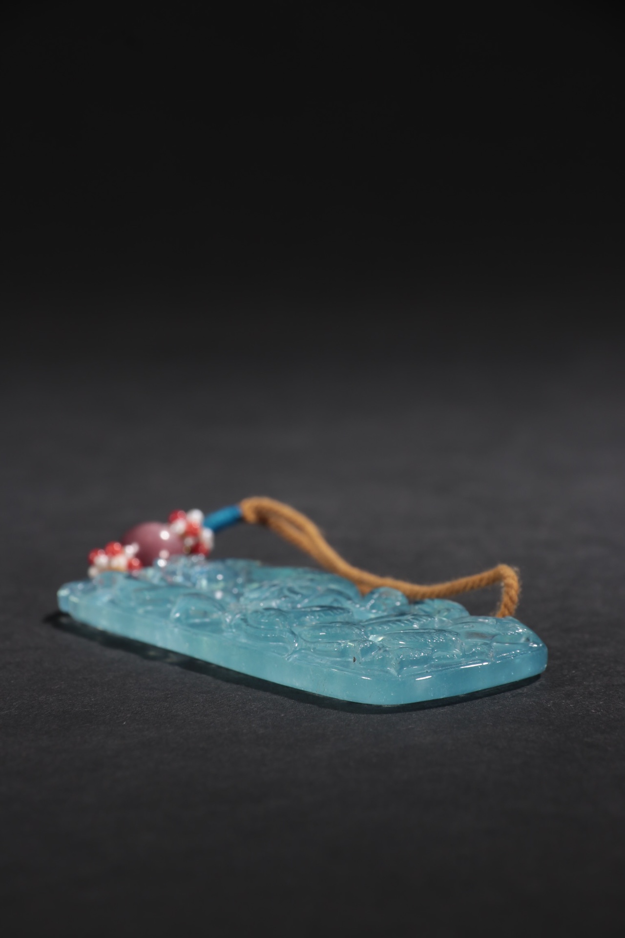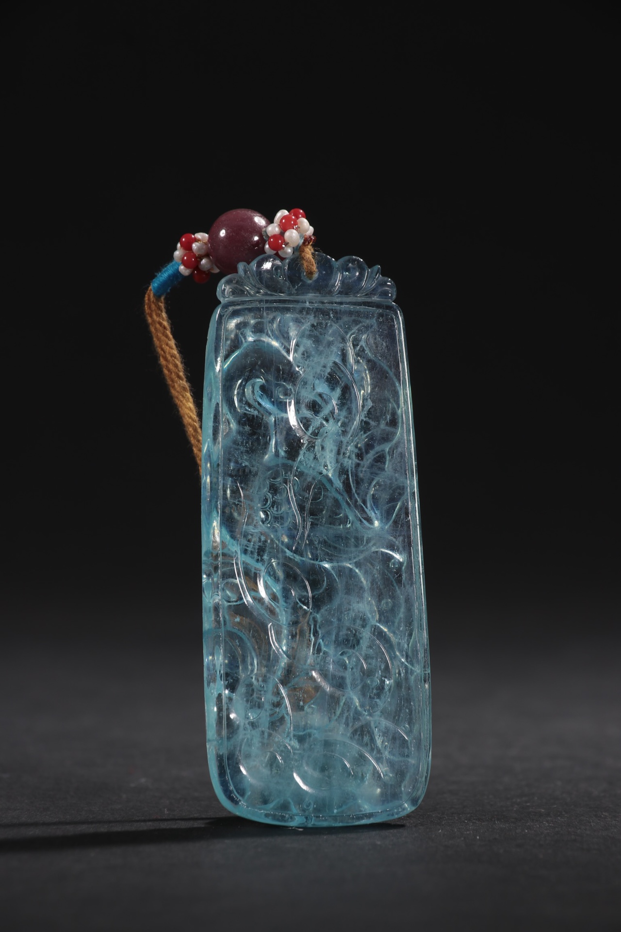 旧藏-海蓝宝石“凤凰纹”佩牌 规格:高8cm长3cm厚0.7cm重37g 天然海蓝宝石料,色泽莹润,质地细腻通透,雕刻“