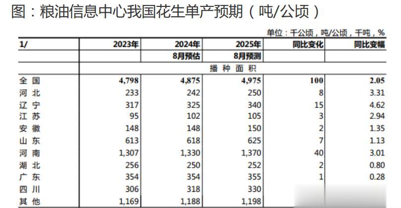 本来今年花生的预期是产量丰收,价格下跌。因为2025年全国的种植面积是500万公顷,比去年还多了10万公顷,产量预期是2020万吨,也比去年多。